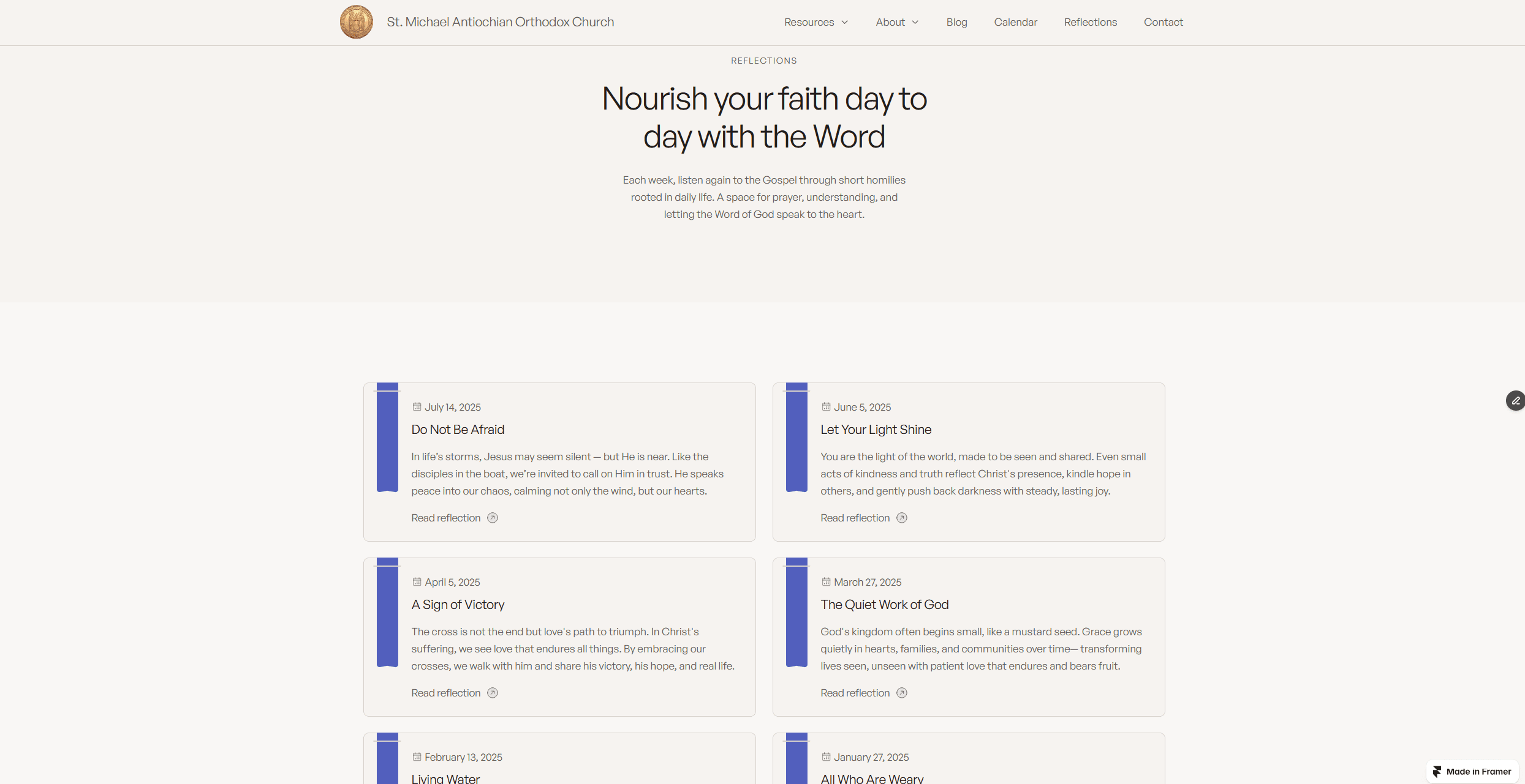 I approached this build as digital architecture—creating a "narthex" (entryway) that prepares the user for the sacred. Using Framer, I built a high-fidelity "Reflections" CMS that allows clergy to easily publish homilies and readings without touching code. I prioritized a mobile-first "Plan Your Visit" flow, placing service times and the "Sacred Giving" portal front-and-center. The aesthetic now mirrors the physical church: using whitespace, liturgical colors, and high-resolution textural imagery (incense, icons, stone) to evoke reverence.